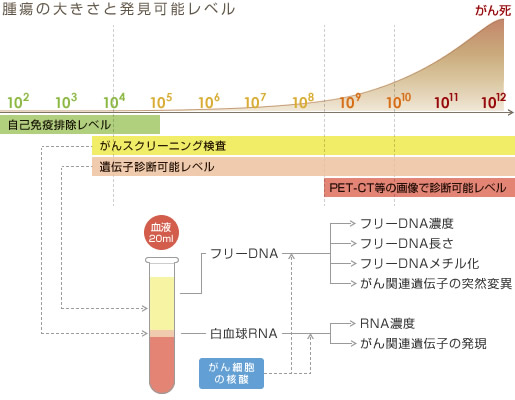 「がん」がある程度大きくなって発症するまでには、通常、がん細胞が増殖を始めてから数年かかります。この発症前の段階でがん細胞を検出することができれば、早期に対策を打つことができるのですが、このような技術は今まで実用化されてきませんでした。しかしようやく、20ml血液だけで発症前の微小がんを検出できる検査が実用化されました。それが当院で行っている「がん遺伝子検査・治療」です。